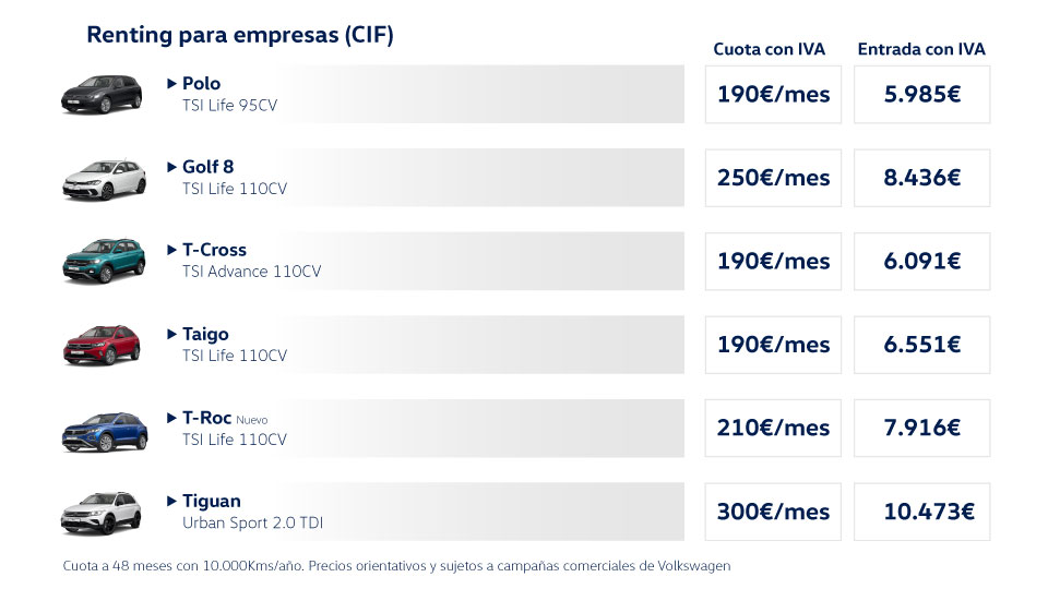 El renting de Volkswagen incluye todo lo que necesitas en la carretera y más. Tú preocúpate de elegir el Volkswagen que quieres, que el resto ya lo ponemos nosotros.